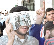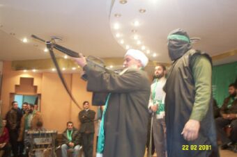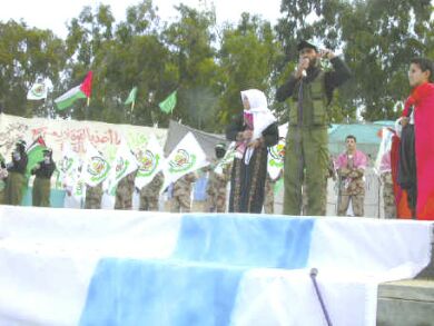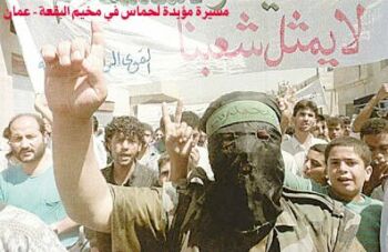 | Amman'da HAMAS yanlısı bir eylem. HAMAS sadece Filistin'in içinde değil dışında da kendini ispat etmiştir. Bu yüzden İslam aleminin birçok ileri geleni bu hareketin mücadelesine destek verdiğini sözlü ve yazılı olarak dile getirmiştir. |