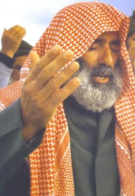 | HAMAS'ın manevi lideri Şeyh Ahmed Yasin FKÖ lideri Arafat'la birlikte. HAMAS, ilk ortaya çıktığı tarihten itibaren sürekli Filistin'deki tüm gruplarla diyalog içinde olmaya çalışmış ve böylece işgalci siyonistlerin Filistinlileri birbirine düşürmeyi hedefleyen fitne oyunlarının önüne geçmeyi başarmıştır. |