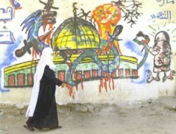 | HAMAS, Siyonistlerin "barış" başlığı altında yürüttükleri çalışmaların bir oyun ve komplo olduğuna inanmaktadır. HAMAS destekçilerinin bu görüşlerini ifade için bir sokak kenarına çizdikleri temsili resim. Gelişmeler de HAMAS'ın bu tespitinde haklı olduğunu ispat etti. |