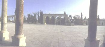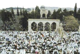 | Mescidi Aksa ile Kubbetu's-Sahra arasında kalan geniş avludan bir görüntü. İşgal güçlerinin bütün engellemelerine rağmen her Cuma bu mekan cemaatle dolmaktadır. |
