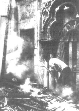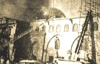 | Mescidi Aksa yangınından bir görüntü. Siyonistlerin Mescidi Aksa'yı ortadan kaldırma girişimleri 1967 Haziran'ında Doğu Kudüs'ü işgal etmelerinden kısa bir süre sonra başladı. 21 Ağustos 1969'da Denis Ruhan adlı fanatik bir yahudi Mescidi Aksa'yı yakma girişiminde bulundu. |