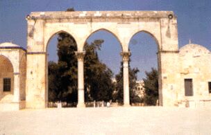 | Mescidi Aksa'nın ana giriş kapısı. Yeryüzünün en faziletli mekânları camiler, camilerin de en faziletlileri Mescidi Haram, Mescidi Nebevi ve Mescidi Aksa'dır. Bu üç camide kılınan namazların diğer camilerde kılınan namazlardan çok daha fazla sevaplı olduğu hadisi şeriflerde bildirilmiştir. |