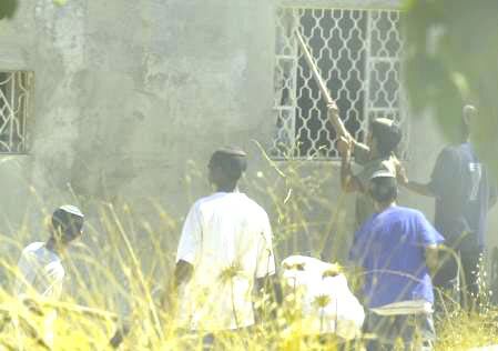 | Müslümanların bir camilerini taşlayan yerleşimciler. el-Halil'de işgalci askerlerin yanı sıra yahudi yerleşimciler de Filistinliler açısından ciddi bir tehlikedir. Ne var ki el-Halil Anlaşması'nda yahudi yerleşimcilerin buradaki varlıkları garantiye alındı. |