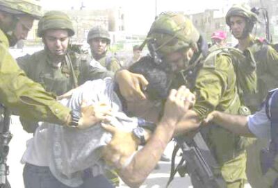 | Filistinli bir küçük çocuğu çekiştiren iki işgalci asker. |