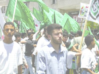 | Özerk yönetimin ABD şartlarını kabul etmesini protesto amacıyla 14 Haziran 2001 tarihinde gerçekleştirilen yürüyüşten bir görüntü. Özerk yönetimin Filistin halkına yönelik zulüm uygulamalarında İsrail işgal devletinin ve ABD'nin direktifleri birinci derecede rol oynamıştır. Fakat şunu da özellikle belirtelim ki iş sadece direktif verme ve almadan ibaret kalmamış fiili bir işbirliği de olmuştur. Gazze'nin Şeyh Rıdvan mahallesindeki patlamada ve HAMAS'ın askeri kanadının istişhadi eylemler biriminin Yahya Ayyaş'tan sonraki başkanı Muhyiddin eş-Şerif'in şehit edilmesinde bu işbirliği gayet bariz bir şekilde kendini göstermiştir. |