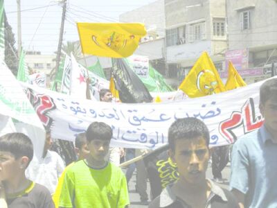| Özerk yönetimin ABD şartlarını kabul etmesini protesto amacıyla 14 Haziran 2001 tarihinde gerçekleştirilen yürüyüşten bir görüntü. Özerk yönetimin bu şartları kabul etmesi İsrail işgal devletinin dayattığı şartları kabul etmesi anlamına geliyordu. Çünkü Amerika'nın özerk yönetimin önüne koyduğu şartlar İsrail işgal devletinin dayattığı şartlardan başka bir şey değildi. Özerk yönetimin bu şartları kabul etmesi ise kendi halkına karşı siyonist işgalcilerin maşası gibi kullanılmayı kabul etmesi anlamına geliyordu. |