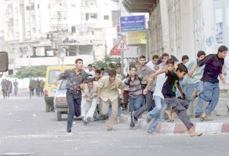 | Polis dehşetinden kaçan gençler. Filistinli gençler ve direniş örgütleri İsrail işgal güçlerine karşı her türlü fedakarlığı göze alarak direnirken, Filistinliler arasında bir fitneye sebep olmamak için mümkün mertebe çatışmadan uzak durmayı tercih ediyorlar. HAMAS bu gelişmeler üzerine yaptığı açıklamada, özerk yönetimin baskıcı tutumuna rağmen Filistinliler arası bir çatışmaya asla fırsat vermeyeceklerini, böyle bir şeyin sadece siyonist işgal rejimine yarayacağını dile getirdi. HAMAS'ın resmi sözcüsü İbrahim Goşe, İngiliz basın mensuplarının bir sorusu üzerine yaptığı açıklamada: "Siyonist işgale karşı direniş amacı üzere kurulmuş olan hareketimiz, Filistinlilerin kanlarının akıtılması sonucuna götürecek bir iç çatışmaya girmeye kesinlikle karşıdır" dedi. |