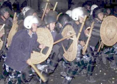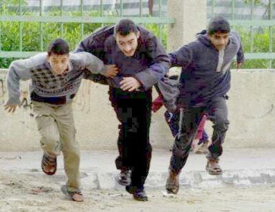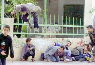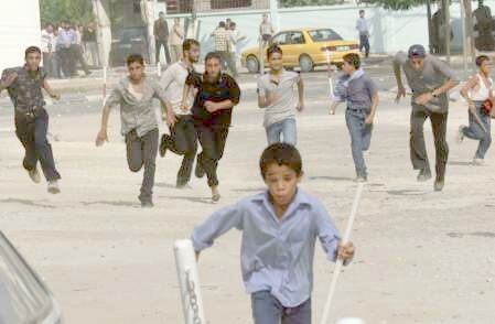 | Özerk yönetim polisinin, Amerika'nın Afganistan'a saldırısını protesto amacıyla 8 Ekim 2001 tarihinde, Gazze üniversiteleri öğrencilerinin ve Gazze'deki orta öğrenim öğrencilerinin birlikte düzenledikleri gösteriyi bastırmak için sergilediği vahşetten kaçan gençler. Bu kaçış da gençlerin Filistinliler arasında bir fitneye sebep olmama konusundaki duyarlılıklarından kaynaklanıyor. Ama ne yazık ki özerk yönetim polisleri bu duyarlılığı göstermiyor ve normalde kendilerini rahatsız etmemesi gerekirken Amerika'yı protesto için bir araya gelen gençleri dağıtmak için copla, silahla onları kovalıyorlar. |