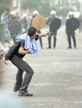 | Polis dehşetine direnen gençler. Gençler normalde polislerle karşı karşıya gelmemeyi tercih ediyorlar. Ancak polislerin iyice haddi aşmaları ve önlerine çıkanları dağıtmak için şiddette iyice ileri gitmeleri, birçok kişiyi yaralamaları, hatta bazı kişilerin ölümüne sebep olmaları, gençlerin de yer yer direnmelerine yol açıyor. Bu tür direnmelere rağmen yine de HAMAS fitnenin önüne geçebilmek için bu tür gelişmelerin yaşandığı her olayın ardından büyük gayret sarf ediyor, Filistinlilerin birbirlerinin kanlarını akıtmamaları için elinden geleni yapıyor. |