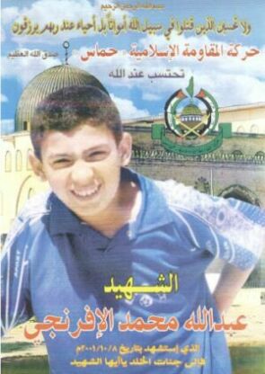 | Özerk yönetim polisinin, Amerika'nın Afganistan'a saldırısını protesto amacıyla 8 Ekim 2001 tarihinde, Gazze üniversiteleri öğrencilerinin ve Gazze'deki orta öğrenim öğrencilerinin birlikte düzenledikleri gösteriyi bastırmak için sergilediği vahşette hayatını kaybeden Abdullah Muhammed el-İfrenci. |