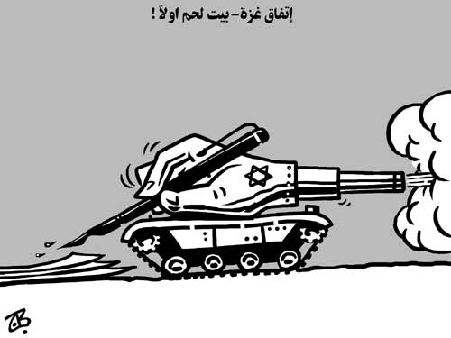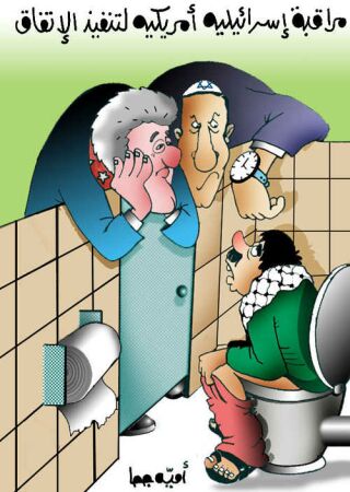 | Bu karikatür "barış" diye yutturulan anlaşmaların gerçeğini gayet özlü bir şekilde ifade ediyor. Gerek özerk yönetimin ve gerekse diğer Arap yönetimlerinin İsrail işgal devletiyle anlaşmaya giden tüm yolları Filistin'in mazlum ve mağdur insanlarının üstünden geçmektedir. Bu anlaşmalara imza atanlar da o ezilen insanların üstlerine basarak anlaşmalara imza atmaktadırlar. |