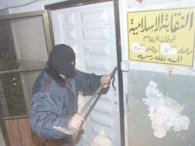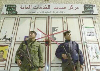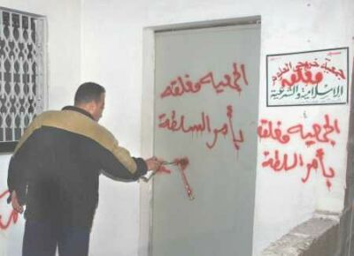 | Nablus'ta İslami Sendika'nın Arafat'ın polisleri tarafından kapatılmasından sonra kapısına 'özerk yönetimin emriyle kapatılmıştır' yazısının yazılması. Özerk yönetim işgal rejimini memnun etmek amacıyla İslami Cemiyet'in Gazze'deki bütün bürolarını, ayrıca İslami Site, İslami Islah Cemiyeti, Müslüman Genç Kızlar Cemiyeti, Mukaddes Topraklar Cemiyeti gibi çeşitli İslami hayır kurumlarının ve sosyal organizasyonların bürolarını kapattı. Bunlardan özellikle İslami Cemiyet ile İslami Islah Cemiyeti (Cemiyetu's-Salah el-İslamiyye) binlerce yetime ve ihtiyaç içindeki aileye düzenli şekilde maddi yardım yapıyordu. |