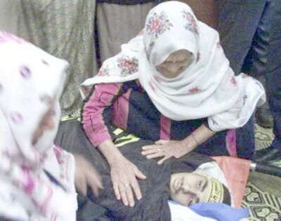 | Özerk yönetim polislerinin 22-12-2001 tarihinde saçtıkları dehşette hayatını kaybeden Muhammed Ehl annesiyle birlikte. Bu annenin yüreği, çocuğunun kendi içlerinden çıkanların haince saldırıları neticesi hayatını kaybetmiş olması sebebiyle çok daha fazla yanmıştır. |