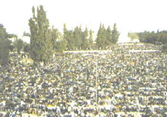 | Mescidi Aksa ile Kubbetu's-Sahra'nın arasını dolduran cemaat. Filistin Müslümanları bu kutsal mabede sahip çıkmak ve onun İslâmî kimliğini korumak amacıyla namaz için ona akın etmekte, özellikle Cuma namazlarında büyük kalabalıklar oluşturmaktadırlar. |