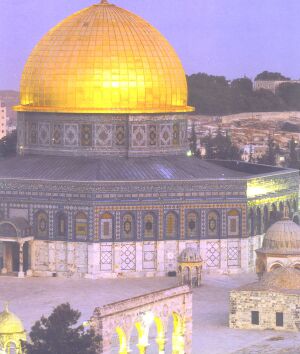 | Kubbetu's-Sahra'nın dıştan görünüşü. Mescidi Aksa, bu mabedin önünde yani kıble istikametinde yer almakta ve her ikisini birden içine alan etrafı surlarla çevrili bölgeye Harem-i Şerif adı verilmektedir. |
