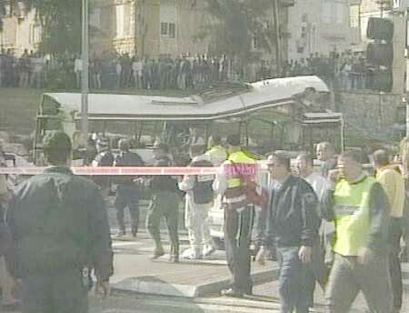Hayfa'daki otobüs eyleminden sonraki bir görüntü. Bütün bu olaylar Filistin halkının kendi öz topraklarında vuku bulmaktadır. Yani Filistin halkı zorla ve gasp yoluyla elinden alınan kendi öz vatanında garip, mağdur ve mazlum duruma düşürülmüştür. Bir halkın işgal edilen vatanını işgalden kurtarmak için gerektiğinde şiddete başvurması ise meşru müdafaa hakkıdır. Zaten tarih de şiddet yoluyla, kuvvet kullanılarak işgal edilen toprak parçalarının geri alınması, işgalden kurtarılması için her zaman kuvvete başvurulduğunu bir realite olarak kayda geçmiştir. |