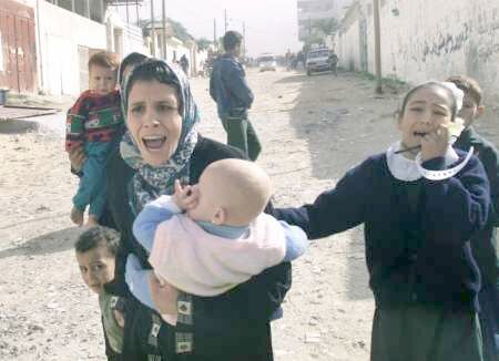 Vahşi saldırının perişan ettiği bir aile. Filistin halkı siyonist terör örgütlerinin Filistin topraklarına girdiği tarihten buyana bir şiddet ve terörle karşı karşıyadır. Bu ise İngiliz işgalcilerin Filistin topraklarını işgal ve ilhak etmeleriyle birlikte başlamıştır. Bu şiddet ve terör sürekli artarak devam etmiştir. |