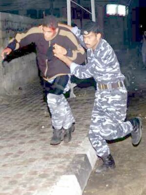 | Arafat'ın polisleri tarafından yaralanan gençlerden biri. Polisler bazen sokağın ortasında insanların üzerine ateş ettiler. Gazze'de HAMAS mensubu Ekrem Selâme adlı bir genç polislerin sokağın ortasında hiçbir sebep yokken üzerine ateş etmeleri sonucu orta derecede yaralandı. 18 Kasım 1994'te yine Gazze'de polislerin, cuma namazından çıkan insanların üzerine ateş açmaları sonucu gerçekleştirdikleri katliam hatıralardan silinmiş değil. |