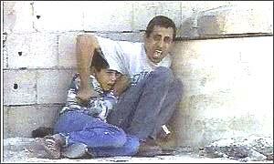 Aksa intifadasının sembolü haline gelen Muhammed Cemal ed-Durre işgalci saldırganların kurşunlarına hedef olduğu esnada, babasının arkasına sığınmış halde |