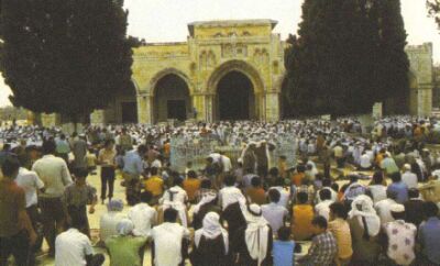 | Mescidi Aksa ile Kubbetu's-Sahra'nın arasını dolduran cemaat. Filistin Müslümanları bu kutsal mabede sahip çıkmak ve onun İslâmî kimliğini korumak amacıyla namaz için ona akın etmekte, özellikle Cuma namazlarında büyük kalabalıklar oluşturmaktadırlar. |