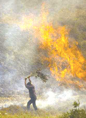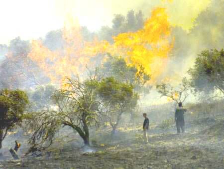 İşgalci saldırganlar tarafından ateşe verilen bir zeytin bahçesi. Ne yazık ki işgalci Siyonist zihniyet, tüm beşeri faziletlere düşman olduğu gibi Allah'ın kullarına lütfettiği bereketlere de düşman olduğunu her hal ü kârda ortaya koyuyor. Bu yüzden Filistin topraklarında kundaktaki bebeklerden yetmişlik ihtiyarlara kadar insanları vahşice katlettiği gibi zeytin ağaçlarını da aynı vahşet üslubuyla katletmektedir. |