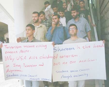 (Amerika'nın Afganistan'a saldırısını protesto amacıyla 8 Ekim 2001 tarihinde, Gazze üniversiteleri öğrencilerinin ve Gazze'deki orta öğrenim öğrencilerinin birlikte düzenledikleri gösteriden görüntüler. Bu protesto gösterisine özerk yönetim polisi şiddetli bir şekilde müdahale etti ve biri çocuk üç kişi Arafat'ın polislerinin eliyle şehit edilirken, 55 öğrenci de yaralandı. Bu durum Arafat yönetiminin işgalci siyonistlerin elinde bir maşa olduğunun göstergesidir.)
