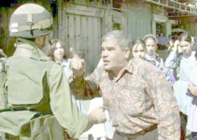 Fotoğraf 3: el-Halil'de bir Filistinli, çocukların okullarına gitmelerinin engellenmemesi için işgalci bir askerle tartışıyor