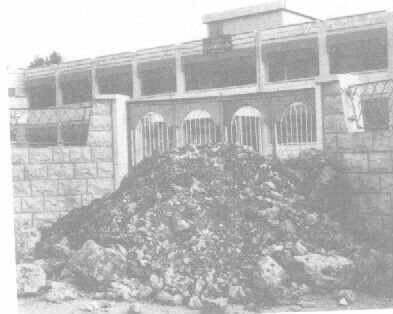 Fotoğraf 9: İşgalci siyonistler tarafından kapatılan ve kapısına da bir yığın toprak dökülen, Filistinlilere ait bir okul. İşgalciler Filistinlilerin eğitim görmelerini engellemek amacıyla bu şekilde ya okullarını kapatarak veya başka yollardan önlerine engeller çıkarmaya çalıştılar. Buna rağmen Filistinliler eğitime büyük önem verdiler. Bu yüzden Filistin halkı, İslam dünyası içinde eğitim düzeyi en iyi olan halklardan biridir.